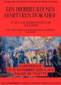 En juillet 1794, 32 religieuses furent condamnées et exécutées à Orange, à cause de leur foi. Plus qu’une date, un chiffre, un événement, c’est le témoignage de ces femmes « de chez nous », de nos villages, de nos communautés, de nos familles, qui continue à briller et porter du fruit. Leur témoignage commun, en prison et jusqu’au martyr est marquant et d’une grande actualité. Le témoignage de chaque groupe de religieuses, selon son charisme, est saisissant. Le témoignage de chacune de ces femmes est l’occasion de laisser naître une amitié spirituelle. Se donner les moyens de les connaitre, de découvrir leurs vies, leurs histoires, leurs témoignages, c’est se permettre de les aimer comme des amies et des sœurs. Ainsi, nous pourrons les prier et recourir à leur intercession avec plus de fruit. Parmi elles, 6 sont originaires de la Drôme.